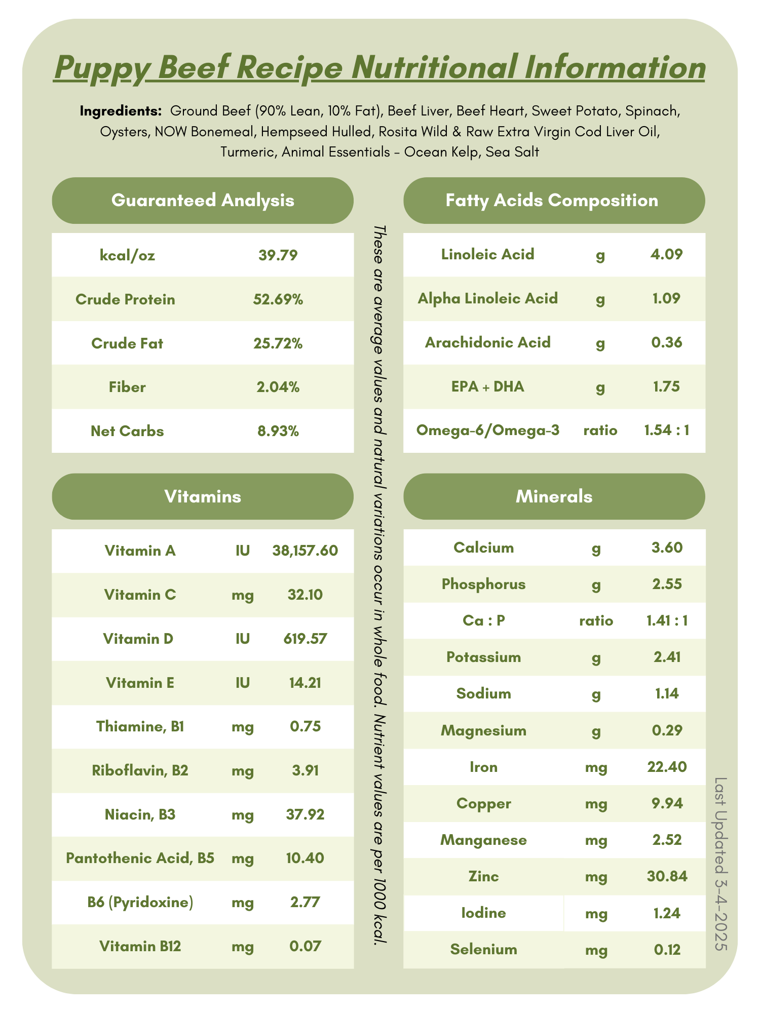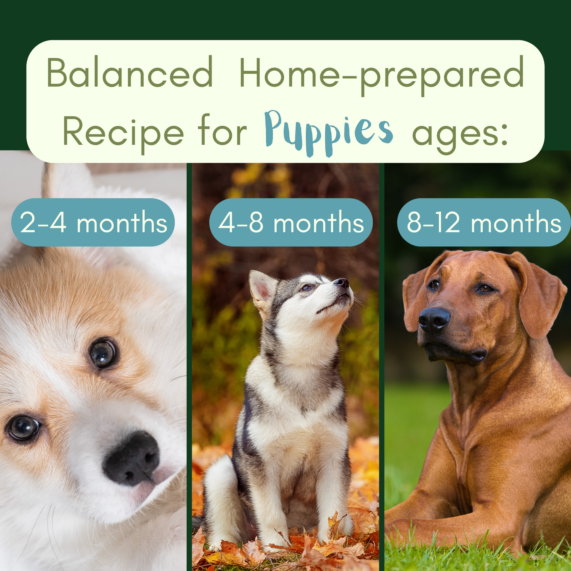 This is a downloadable recipe for puppies. The recipe provides step-by-step instructions to create a nutritionally balanced meal when mixed with Dr. Evelyn's Nutrient Blend. Create a meal that's healthy, delicious, and homemade with the added assurance that it is complete and balanced entirely with whole foods.