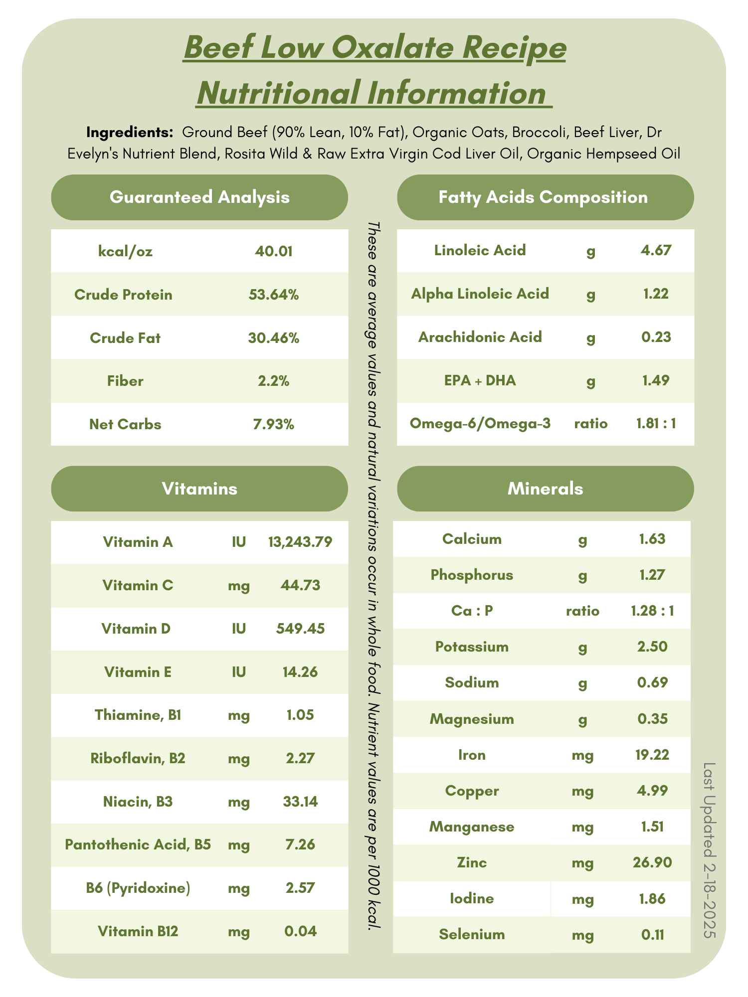 --Dr. Evelyn's Low Oxalate Beef Dog Food Recipe is formulated to meet the nutritional levels established by the AAFCO Dog Food Nutrient Profiles for maintenance.--