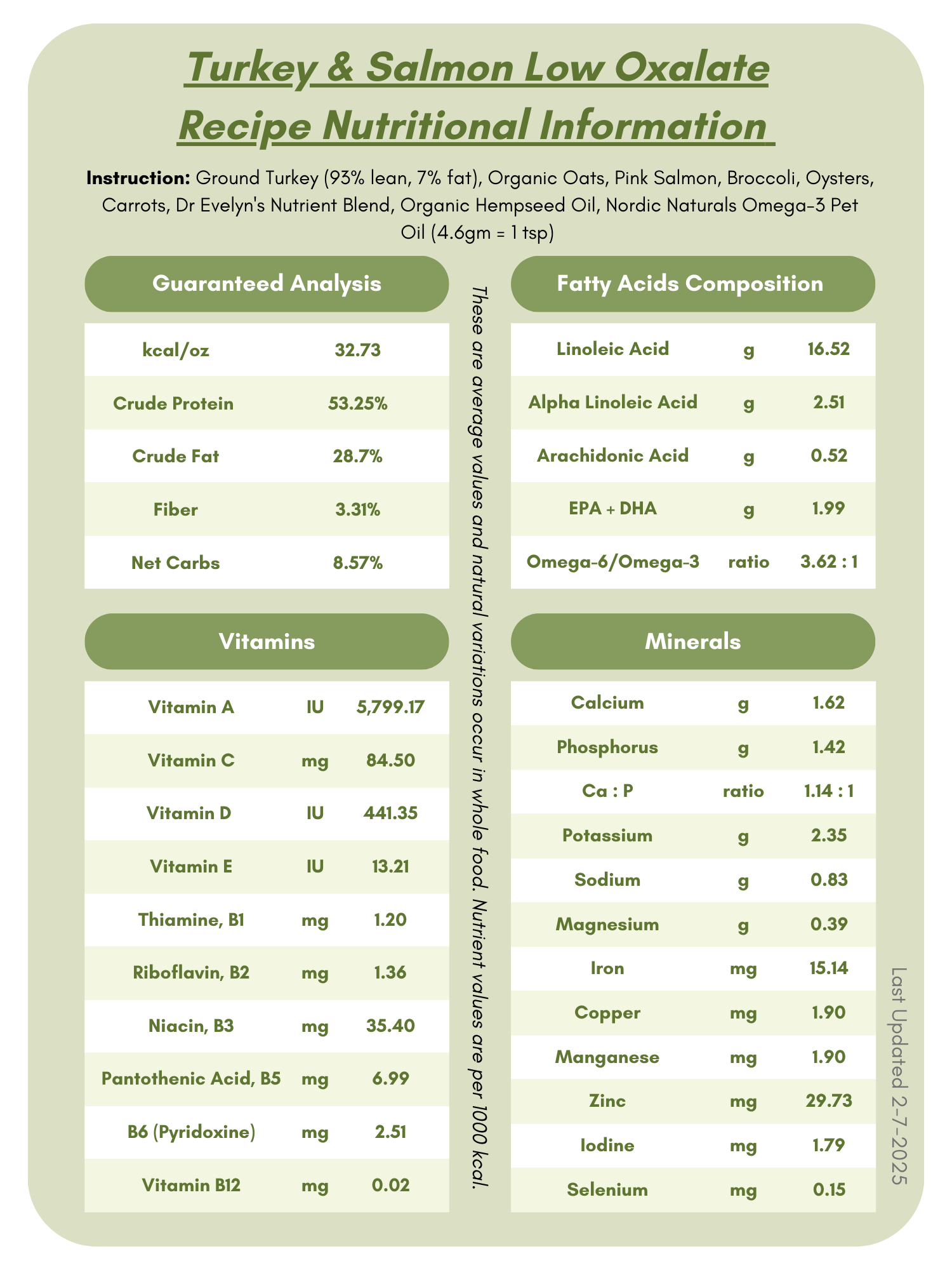 --Dr. Evelyn's Low Oxalate Turkey & Salmon Dog Food Recipe is formulated to meet the nutritional levels established by the AAFCO Dog Food Nutrient Profiles for maintenance.--